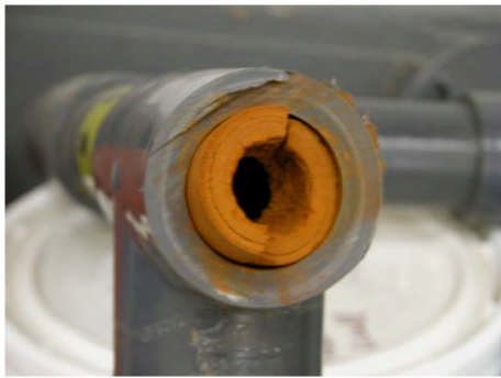 The guidelines for hardness are based on aesthetic, rather than health concerns. Hard water causes scale to form in water pipes, plumbing fixtures and kitchen appliances (see photo). Scale build-up in hot water tanks and boilers increases heating costs and can lead to premature failure of heating equipment. Scale deposited in clothing during washing will cause increased wear and tear on fabrics. Soap reacts with hard water to form a curd and can also cause skin flaking and irritation. In addition, when washing or doing laundry with hard water, more soap or detergent is needed.
