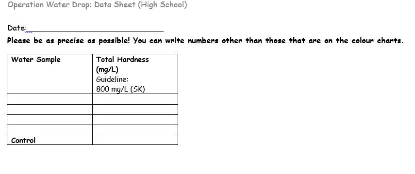 Determination will be done by using a test strip method. You will compare the different results, you will also see if the water meets the Saskatchewan Guideline Limit Sample (SGLS).