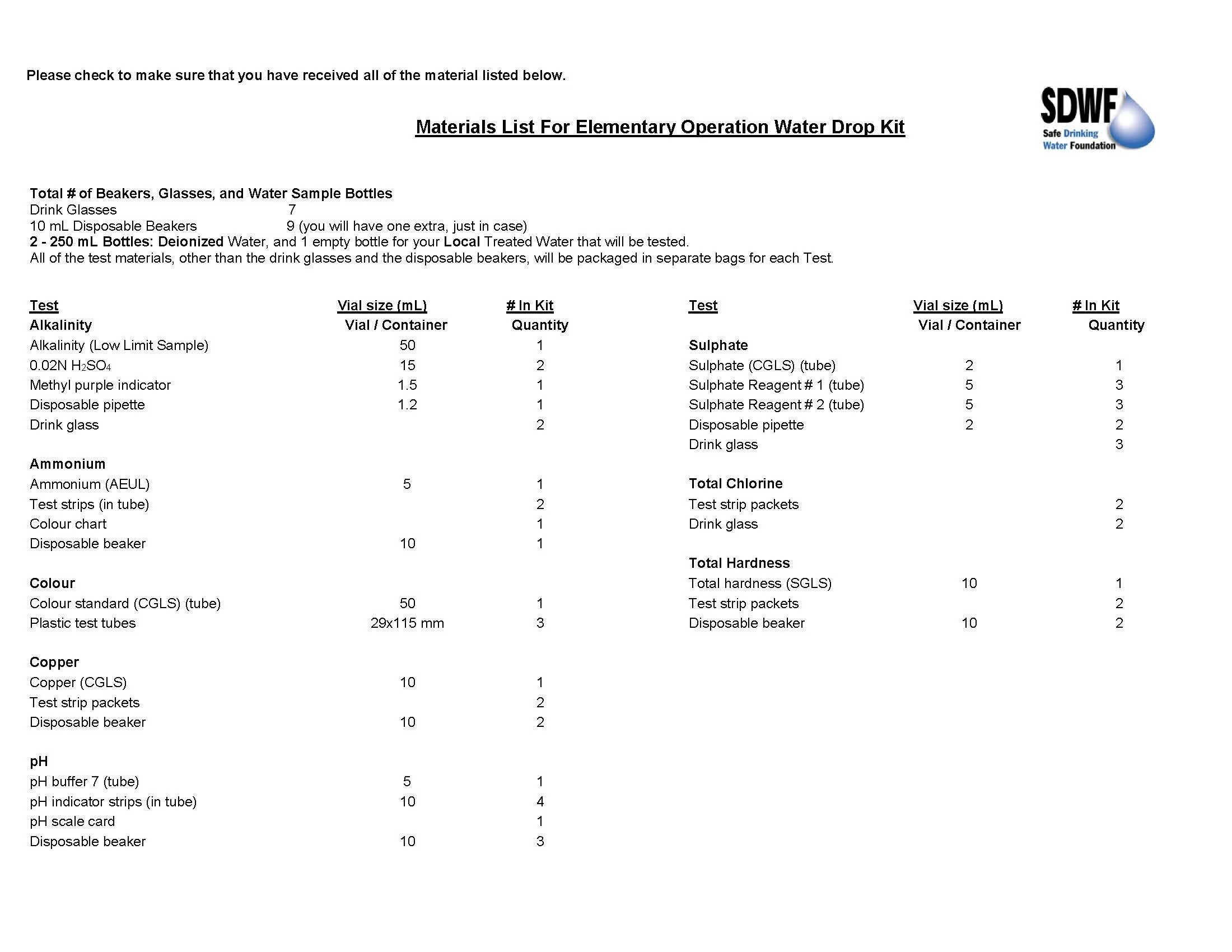 Materials: Each Operation Water Drop Test Kit contains 8 test supply bags with all requirements for testing your drinking water, and the Canadian Drinking Water Guideline Limit sample; for each analyte tested all supplies required are packaged in one bag for your convenience. You will find a list of all materials sent in the OWD kit; please cross-reference your list with material received to ensure you have all of the material required.